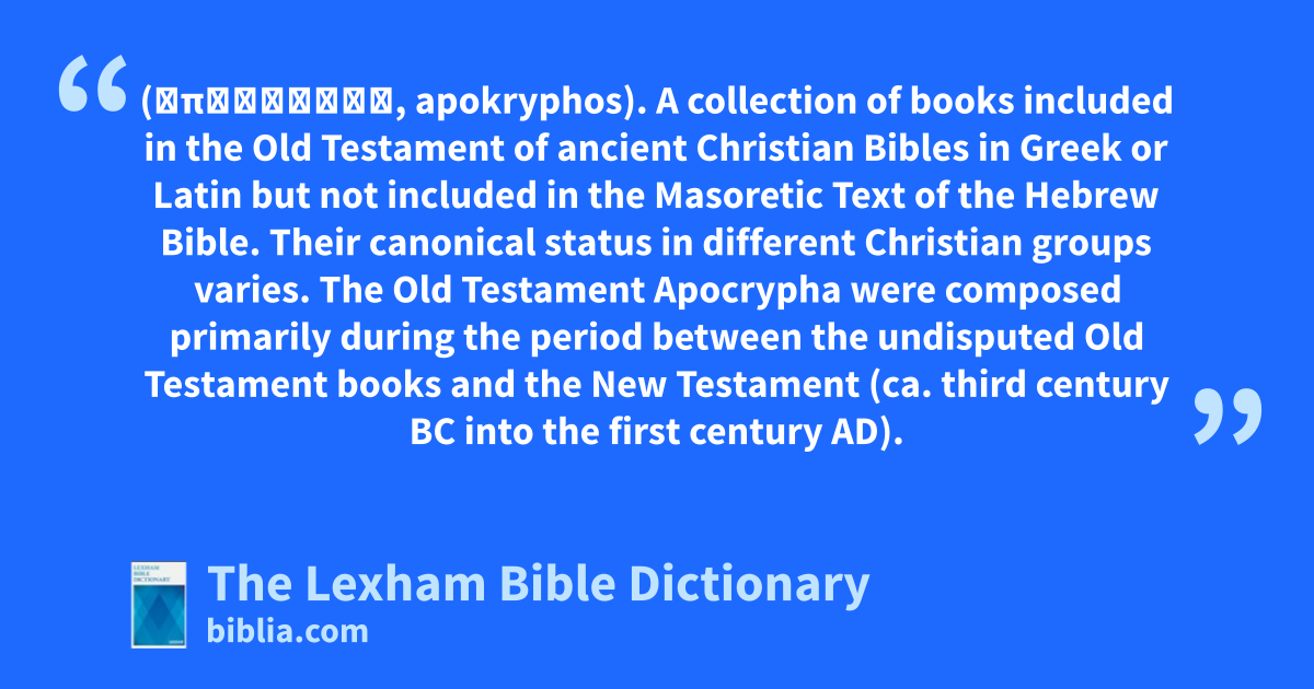 Apocrypha, Old Testament (ἀπόκρυφος, apokryphos). A collection of books included in the Old Testament of ancient Christian Bibles in Greek or Latin but not included in the Masoretic Text of the Hebrew Bible. Their canonical status in different Christian groups varies. The Old Testament Apocrypha were composed primarily during the period between the undisputed Old Testament books and the New Testament (ca. third century bc into the first century ad).