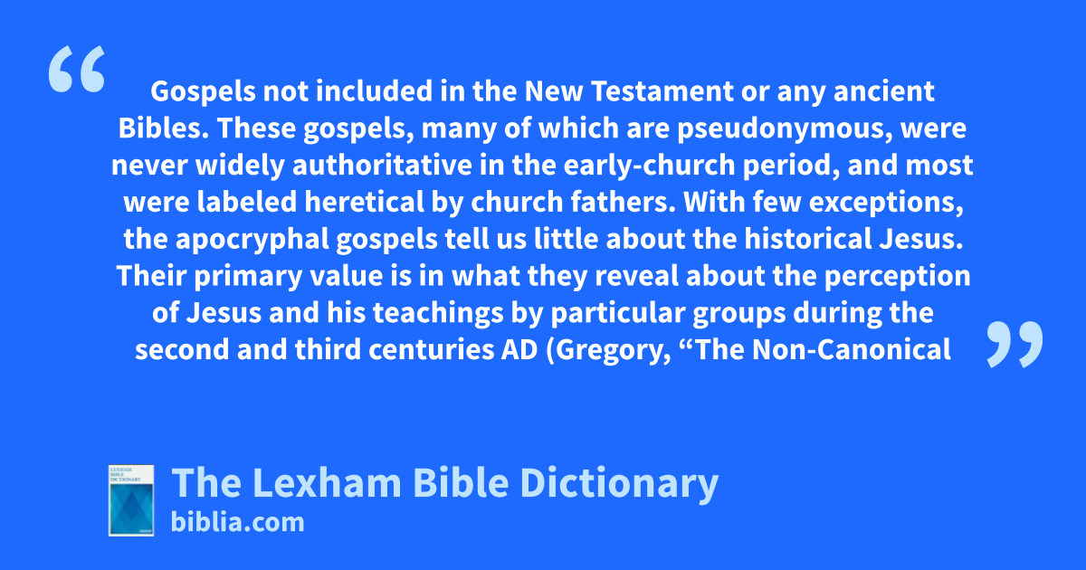 Apocryphal Gospels Gospels not included in the New Testament or any ancient Bibles. These gospels, many of which are pseudonymous, were never widely authoritative in the early-church period, and most were labeled heretical by church fathers. With few exceptions, the apocryphal gospels tell us little about the historical Jesus. Their primary value is in what they reveal about the perception of Jesus and his teachings by particular groups during the second and third centuries ad (Gregory, “The Non-Canonical Gospels,” 3; Foster, “Preface,” xvii—xviii).