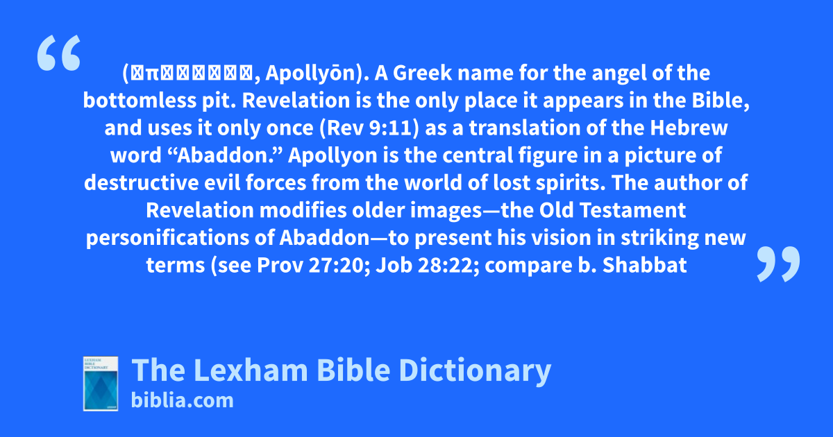 Apollyon (Ἀπολλύων, Apollyōn). A Greek name for the angel of the bottomless pit. Revelation is the only place it appears in the Bible, and uses it only once (Rev 9:11) as a translation of the Hebrew word “Abaddon.”