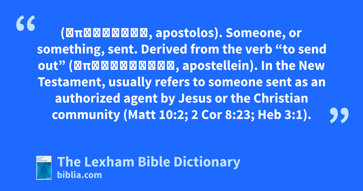 Apostle (ἀπόστολος, apostolos). Someone, or something, sent. Derived from the verb “to send out” (ἀποστέλλειν, apostellein). In the New Testament, usually refers to someone sent as an authorized agent by Jesus or the Christian community (Matt 10:2; 2 Cor 8:23; Heb 3:1).