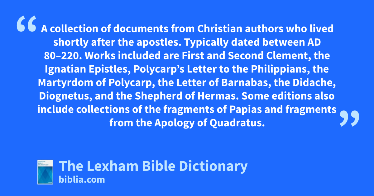 Apostolic Fathers A collection of documents from Christian authors who lived shortly after the apostles. Typically dated between ad 80–220. Works included are First and Second Clement, the Ignatian Epistles, Polycarp’s Letter to the Philippians, the Martyrdom of Polycarp, the Letter of Barnabas, the Didache, Diognetus, and the Shepherd of Hermas. Some editions also include collections of the fragments of Papias and fragments from the Apology of Quadratus.
