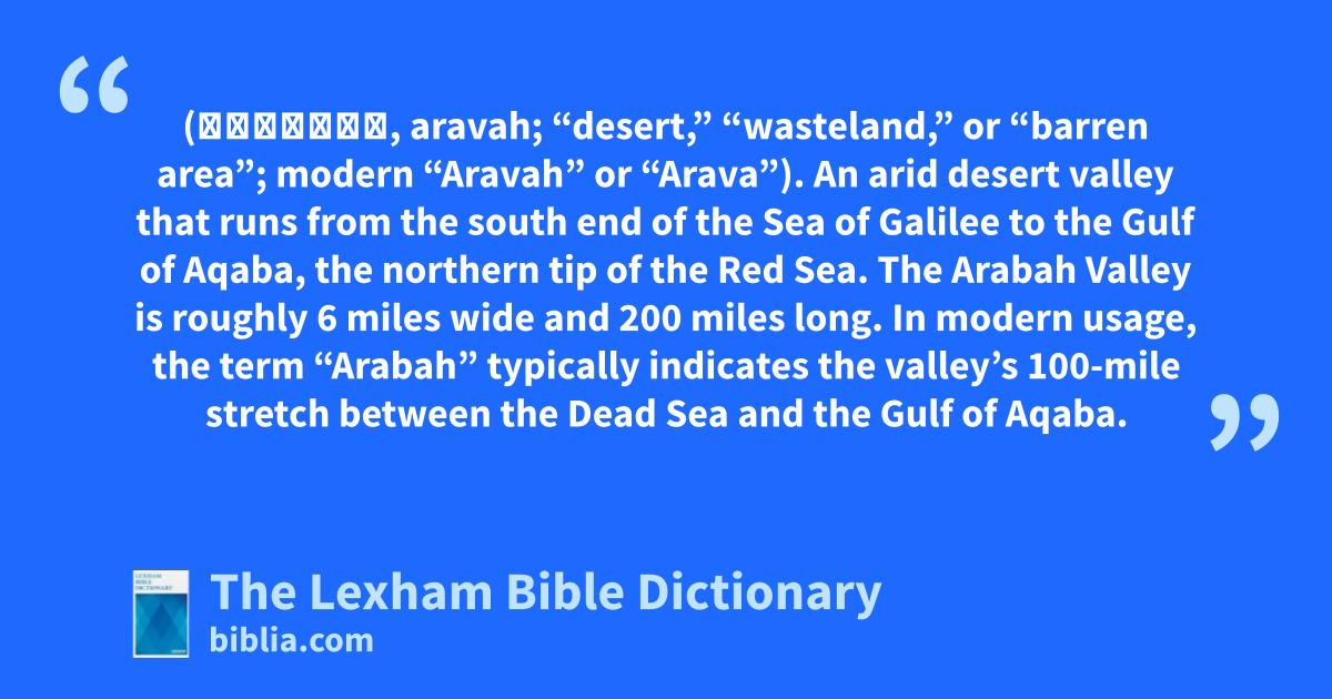 Arabah (עֲרָבָה, aravah; “desert,” “wasteland,” or “barren area”; modern “Aravah” or “Arava”). An arid desert valley that runs from the south end of the Sea of Galilee to the Gulf of Aqaba, the northern tip of the Red Sea. The Arabah Valley is roughly 6 miles wide and 200 miles long. In modern usage, the term “Arabah” typically indicates the valley’s 100-mile stretch between the Dead Sea and the Gulf of Aqaba.