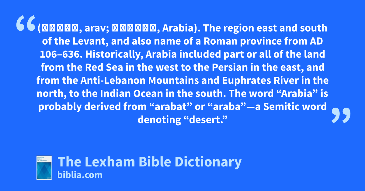 Arabia (עֲרָב, arav; Ἀραβία, Arabia). The region east and south of the Levant, and also name of a Roman province from ad 106–636. Historically, Arabia included part or all of the land from the Red Sea in the west to the Persian in the east, and from the Anti-Lebanon Mountains and Euphrates River in the north, to the Indian Ocean in the south. The word “Arabia” is probably derived from “arabat” or “araba”—a Semitic word denoting “desert.”