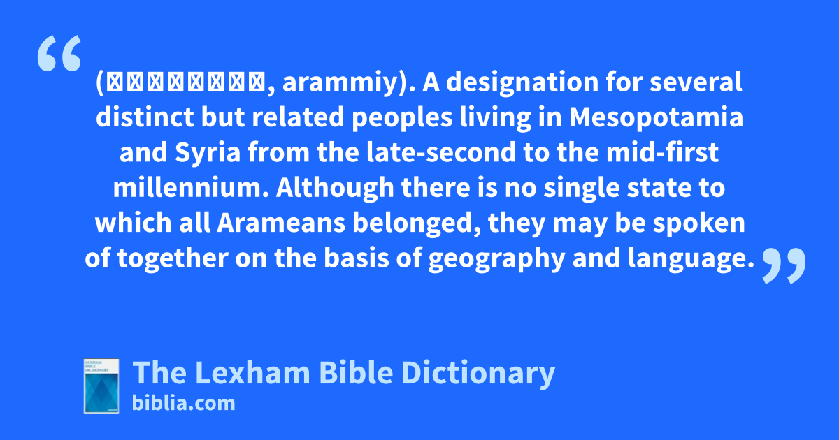 Arameans (אֲרַמִּי, arammiy). A designation for several distinct but related peoples living in Mesopotamia and Syria from the late-second to the mid-first millennium. Although there is no single state to which all Arameans belonged, they may be spoken of together on the basis of geography and language.