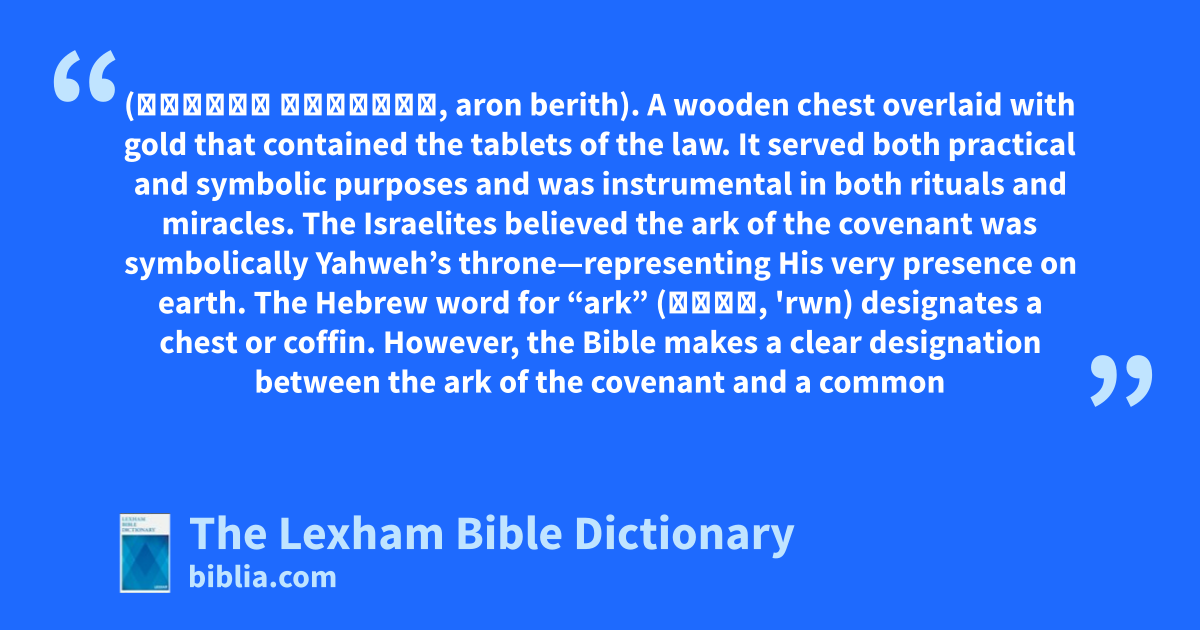 Ark of the Covenant (אֲרוֹן בְּרִית, aron berith). A wooden chest overlaid with gold that contained the tablets of the law. It served both practical and symbolic purposes and was instrumental in both rituals and miracles. The Israelites believed the ark of the covenant was symbolically Yahweh’s throne—representing His very presence on earth.