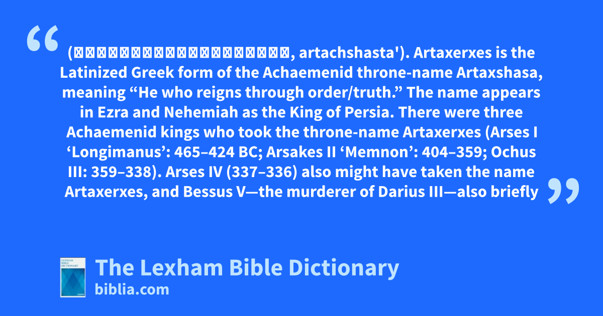 Artaxerxes (אַרְתַּחְשַׁשְׂתָּא, artachshasta'). Artaxerxes is the Latinized Greek form of the Achaemenid throne-name Artaxshasa, meaning “He who reigns through order/truth.” The name appears in Ezra and Nehemiah as the King of Persia. There were three Achaemenid kings who took the throne-name Artaxerxes (Arses I ‘Longimanus’: 465–424 bc; Arsakes II ‘Memnon’: 404–359; Ochus III: 359–338). Arses IV (337–336) also might have taken the name Artaxerxes, and Bessus V—the murderer of Darius III—also briefly used it (330 bc).