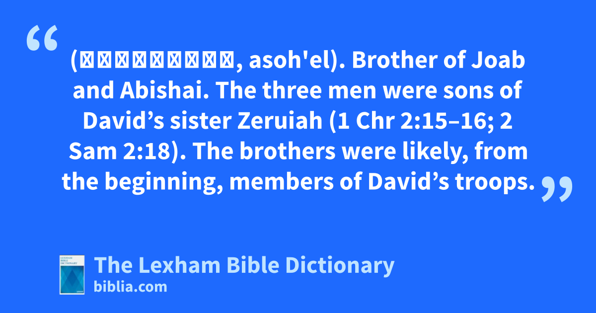 Asahel, Son of Zeruiah (עֲשָׂהאֵל, asoh'el). Brother of Joab and Abishai. The three men were sons of David’s sister Zeruiah (1 Chr 2:15–16; 2 Sam 2:18). The brothers were likely, from the beginning, members of David’s troops.