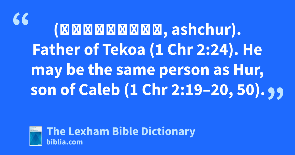 Ashhur, Son of Caleb (אַשְׁחוּר, ashchur). Father of Tekoa (1 Chr 2:24). He may be the same person as Hur, son of Caleb (1 Chr 2:19–20, 50).