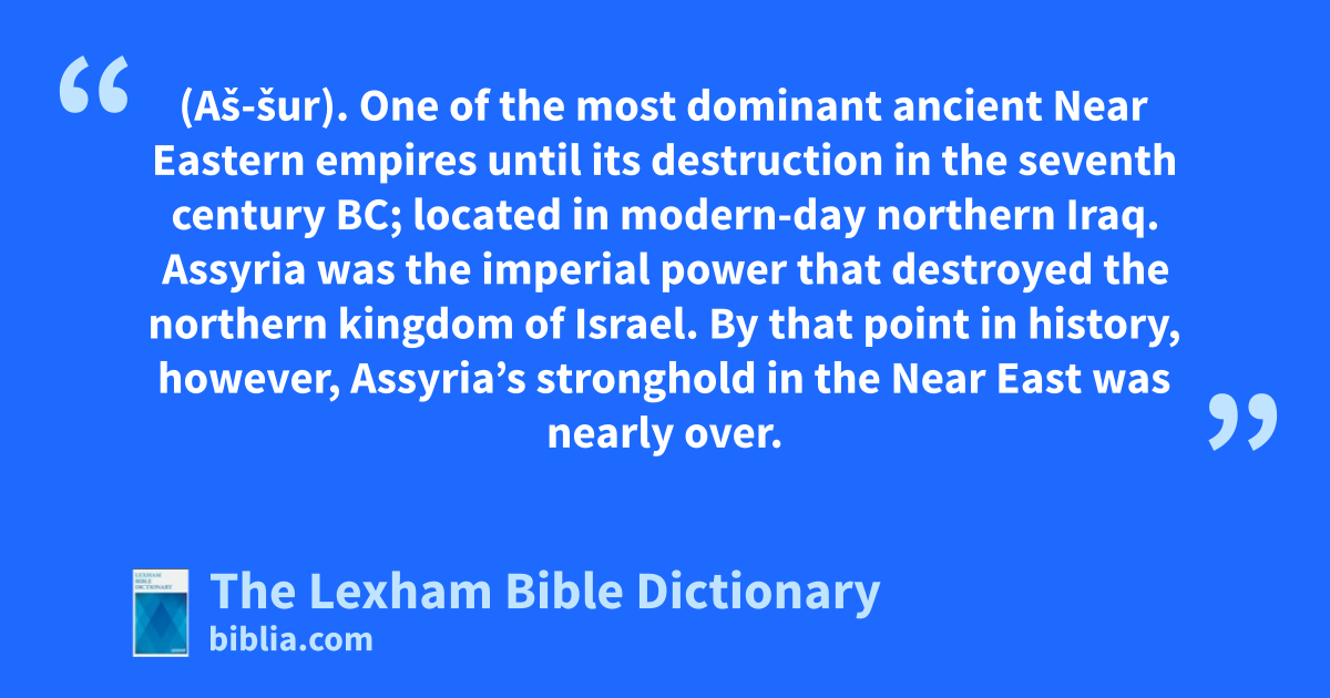 Assyria (Aš-šur). One of the most dominant ancient Near Eastern empires until its destruction in the seventh century bc; located in modern-day northern Iraq. Assyria was the imperial power that destroyed the northern kingdom of Israel. By that point in history, however, Assyria’s stronghold in the Near East was nearly over.