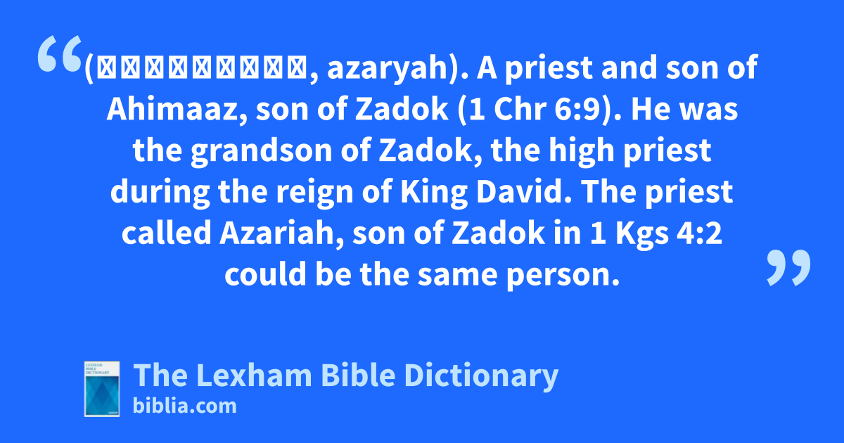 Azariah, Son of Ahimaaz (עֲזַרְיָה, azaryah). A priest and son of Ahimaaz, son of Zadok (1 Chr 6:9). He was the grandson of Zadok, the high priest during the reign of King David. The priest called Azariah, son of Zadok in 1 Kgs 4:2 could be the same person.