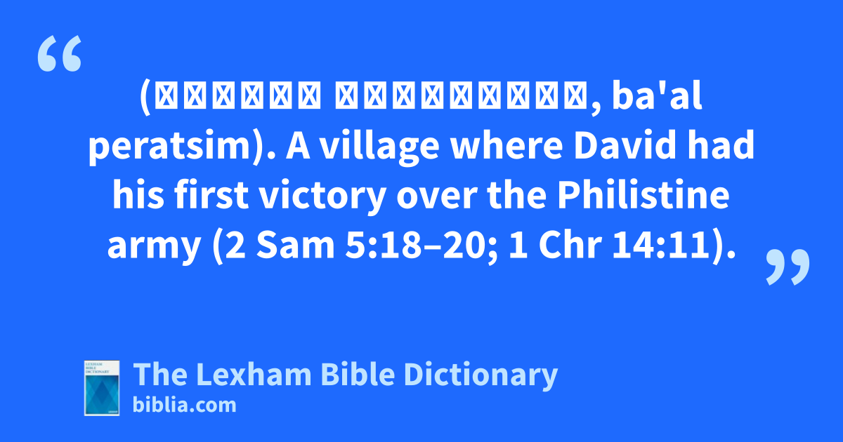 Baal-Perazim (בַּעַל פְּרָצִים, ba'al peratsim). A village where David had his first victory over the Philistine army (2 Sam 5:18–20; 1 Chr 14:11).
