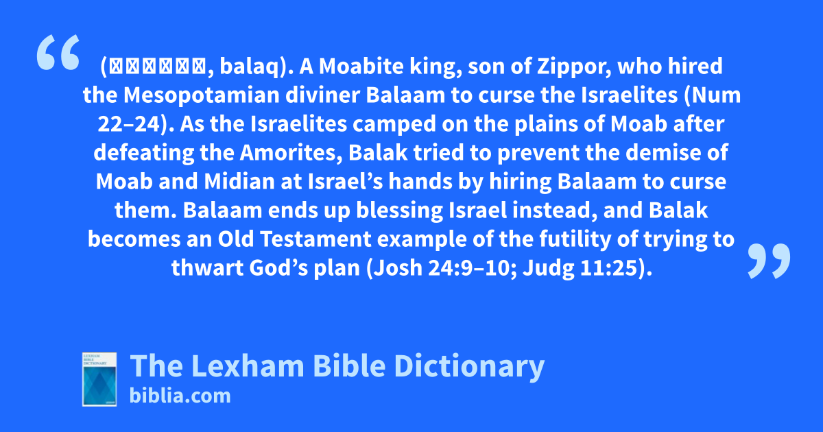 Balak, Son of Zippor (בָּלָק, balaq). A Moabite king, son of Zippor, who hired the Mesopotamian diviner Balaam to curse the Israelites (Num 22–24). As the Israelites camped on the plains of Moab after defeating the Amorites, Balak tried to prevent the demise of Moab and Midian at Israel’s hands by hiring Balaam to curse them. Balaam ends up blessing Israel instead, and Balak becomes an Old Testament example of the futility of trying to thwart God’s plan (Josh 24:9–10; Judg 11:25).