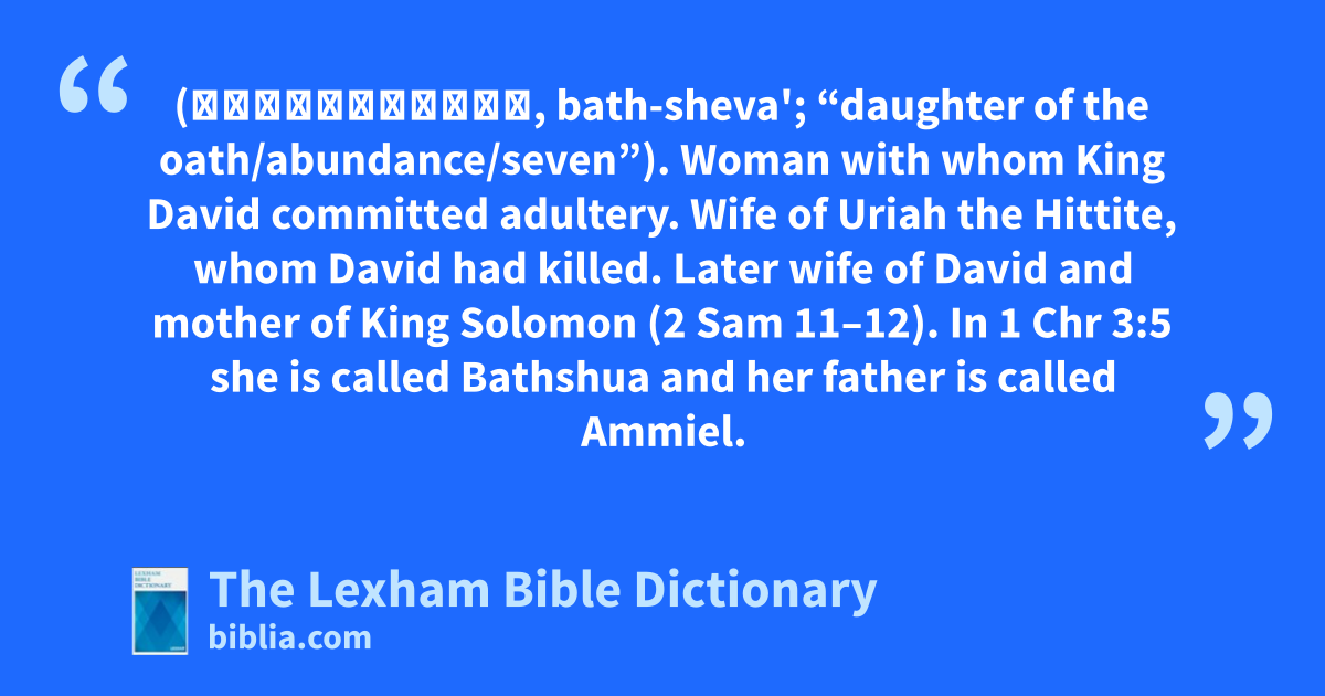 Bathsheba, Daughter of Eliam (בַּת־שֶׁבַע, bath-sheva'; “daughter of the oath/abundance/seven”). Woman with whom King David committed adultery. Wife of Uriah the Hittite, whom David had killed. Later wife of David and mother of King Solomon (2 Sam 11–12). In 1 Chr 3:5 she is called Bathshua and her father is called Ammiel.