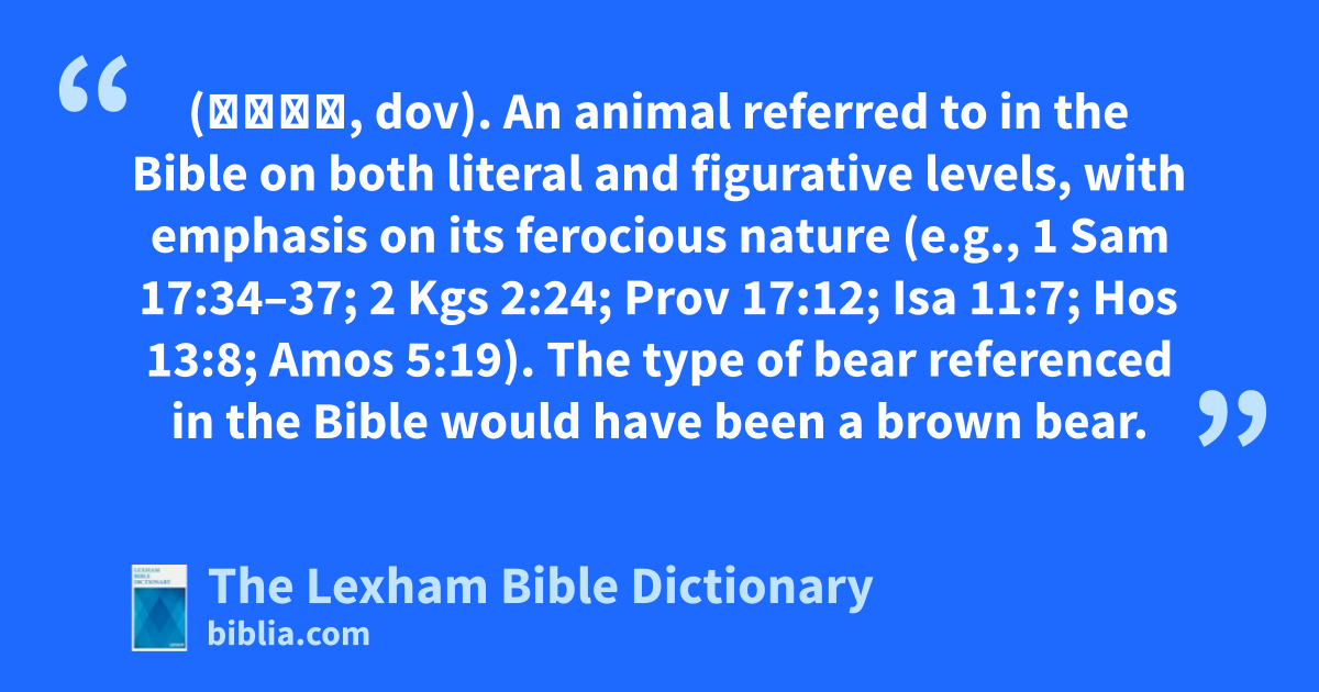 Bear (דֹּב, dov). An animal referred to in the Bible on both literal and figurative levels, with emphasis on its ferocious nature (e.g., 1 Sam 17:34–37; 2 Kgs 2:24; Prov 17:12; Isa 11:7; Hos 13:8; Amos 5:19). The type of bear referenced in the Bible would have been a brown bear.