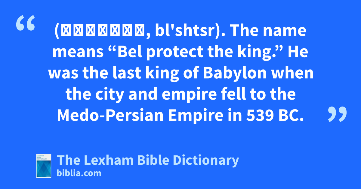 Belshazzar, King of Babylon (בלאשׁצר, bl'shtsr). The name means “Bel protect the king.” He was the last king of Babylon when the city and empire fell to the Medo-Persian Empire in 539 bc.