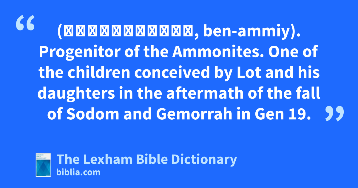 Ben-Ammi, Son of Lot (בֶּן־עַמִּי, ben-ammiy). Progenitor of the Ammonites. One of the children conceived by Lot and his daughters in the aftermath of the fall of Sodom and Gemorrah in Gen 19.