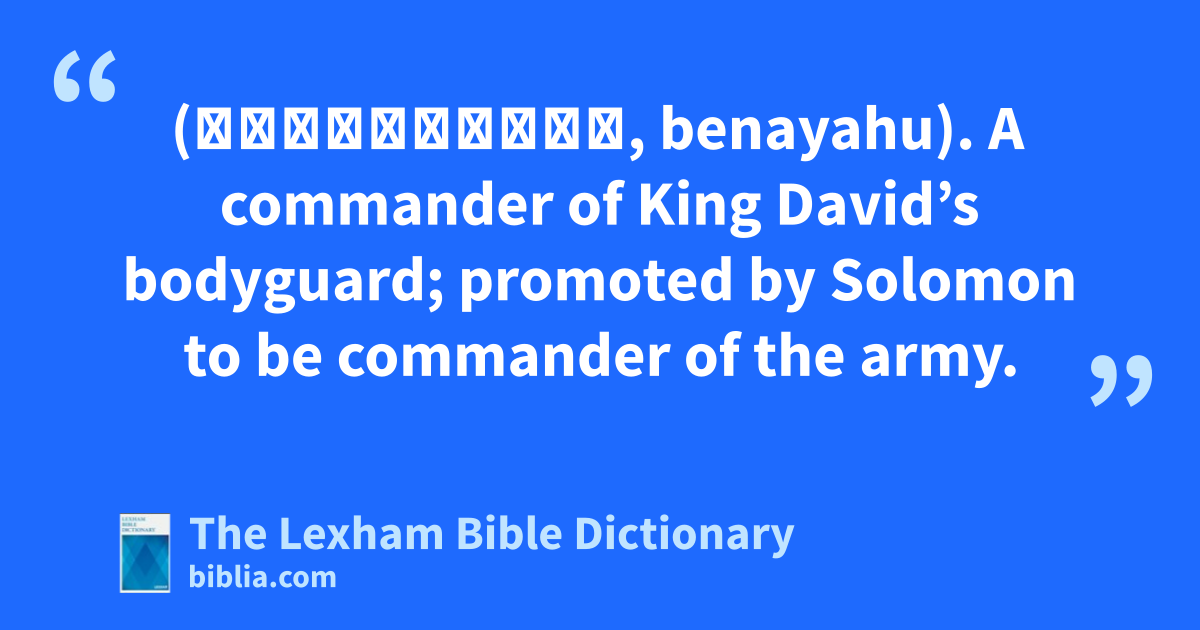 Benaiah, Son of Jehoiada (בְּנָיָהוּ, benayahu). A commander of King David’s bodyguard; promoted by Solomon to be commander of the army.