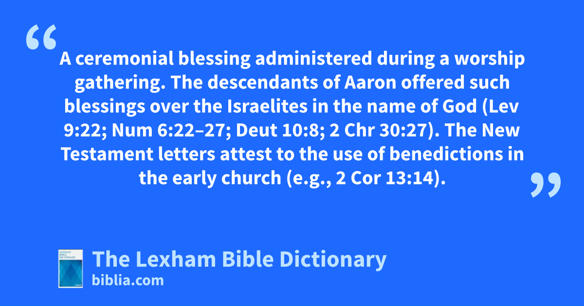 Benediction A ceremonial blessing administered during a worship gathering. The descendants of Aaron offered such blessings over the Israelites in the name of God (Lev 9:22; Num 6:22–27; Deut 10:8; 2 Chr 30:27). The New Testament letters attest to the use of benedictions in the early church (e.g., 2 Cor 13:14).