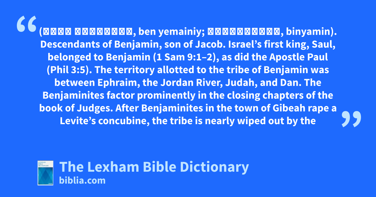 Benjamin, Tribe Of (בֵּן יְמָינִי, ben yemainiy; בִּנְיָמִן, binyamin). Descendants of Benjamin, son of Jacob. Israel’s first king, Saul, belonged to Benjamin (1 Sam 9:1–2), as did the Apostle Paul (Phil 3:5). The territory allotted to the tribe of Benjamin was between Ephraim, the Jordan River, Judah, and Dan. The Benjaminites factor prominently in the closing chapters of the book of Judges. After Benjaminites in the town of Gibeah rape a Levite’s concubine, the tribe is nearly wiped out by the 11 other tribes. For further information, see this article: Israel, Tribes of.