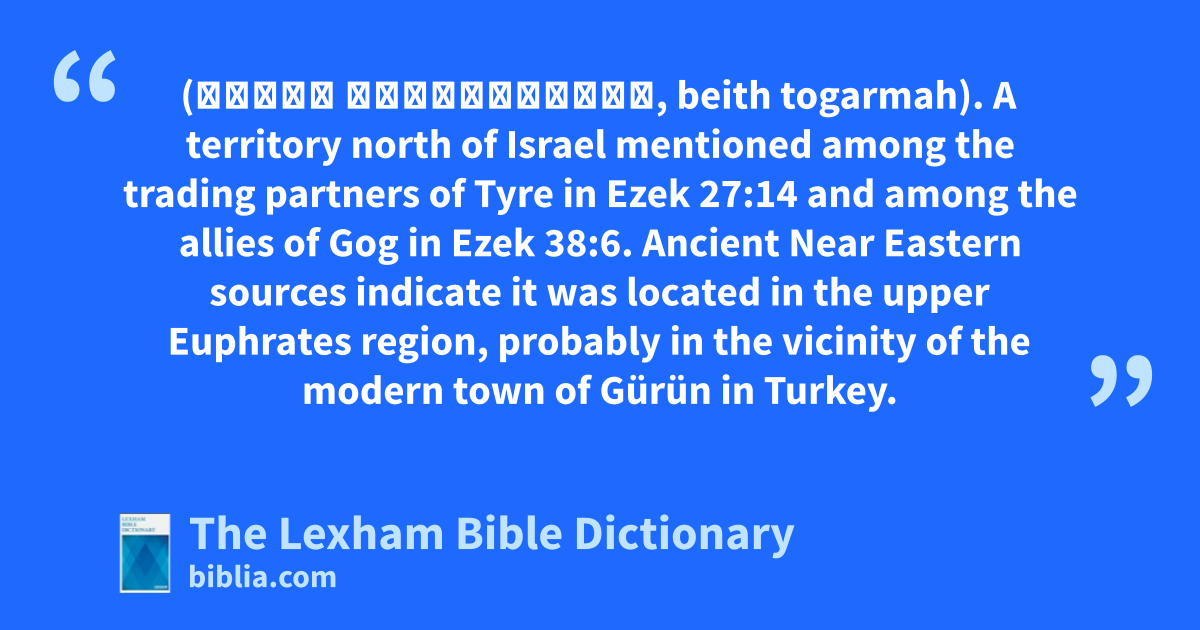 Beth-Togarmah (בֵּית תּוֹגַרְמָה, beith togarmah). A territory north of Israel mentioned among the trading partners of Tyre in Ezek 27:14 and among the allies of Gog in Ezek 38:6. Ancient Near Eastern sources indicate it was located in the upper Euphrates region, probably in the vicinity of the modern town of Gürün in Turkey.