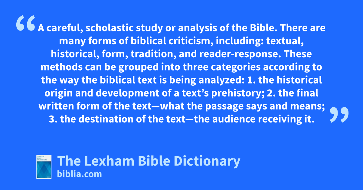 Biblical Criticism A careful, scholastic study or analysis of the Bible. There are many forms of biblical criticism, including: textual, historical, form, tradition, and reader-response. These methods can be grouped into three categories according to the way the biblical text is being analyzed: