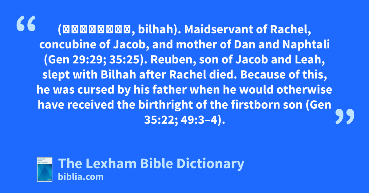 Bilhah, Concubine of Jacob (בִּלְהָה, bilhah). Maidservant of Rachel, concubine of Jacob, and mother of Dan and Naphtali (Gen 29:29; 35:25). Reuben, son of Jacob and Leah, slept with Bilhah after Rachel died. Because of this, he was cursed by his father when he would otherwise have received the birthright of the firstborn son (Gen 35:22; 49:3–4).