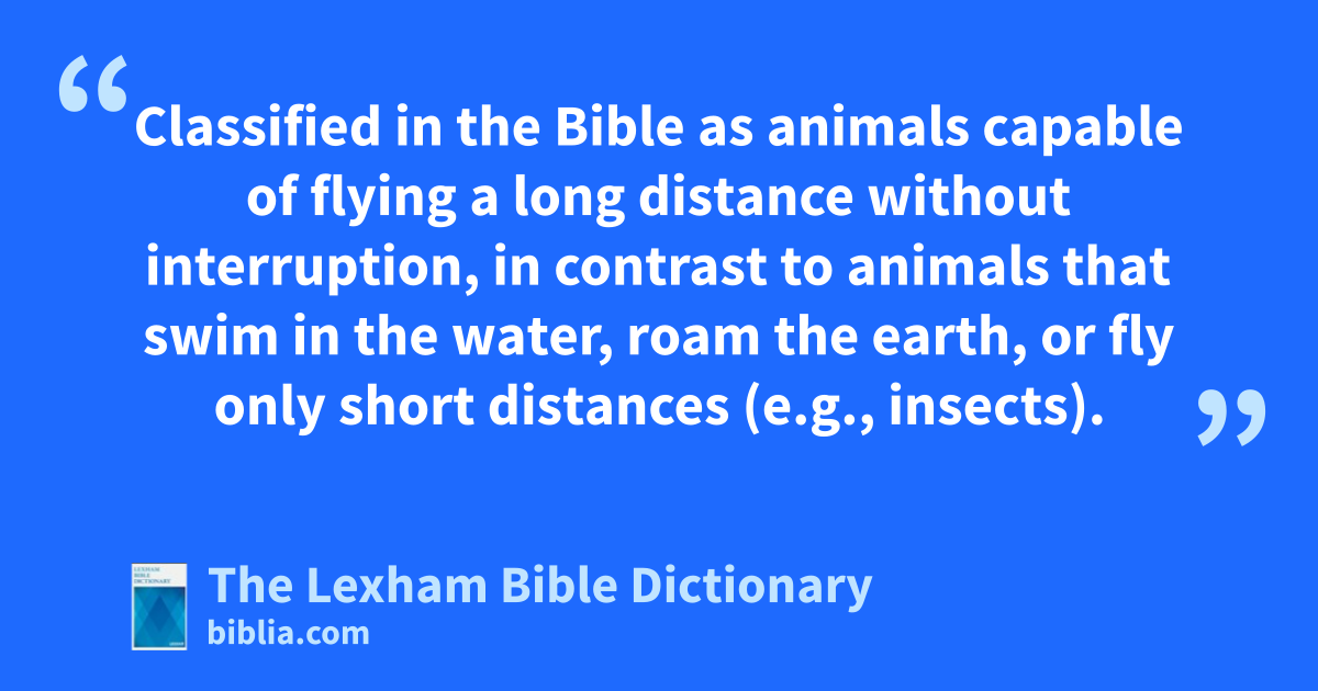 Birds Classified in the Bible as animals capable of flying a long distance without interruption, in contrast to animals that swim in the water, roam the earth, or fly only short distances (e.g., insects).