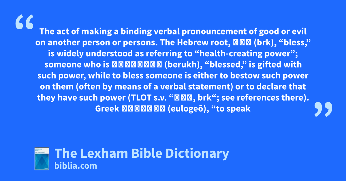 The Hebrew root, ברך (brk), “bless,” is widely understood as referring to “health-creating power”; someone who is בְּרוּךְ (berukh), “blessed,” is gifted with such power, while to bless someone is either to bestow such power on them (often by means of a verbal statement) or to declare that they have such power (TLOT s.v. “ברך, brk“; see references there). Greek εὐλογέω (eulogeō), “to speak well,” was used in the Septuagint and other ancient Jewish writings to translate Hebrew brk, and took on the meaning of “to bless” from the Hebrew word (TDNT s.v. “εὐλογέω, eulogeō,” 754). To curse someone, by contrast, is to bestow ill effects on someone (again often by means of a verbal statement; TLOT s.v. “ארר, 'rr”).