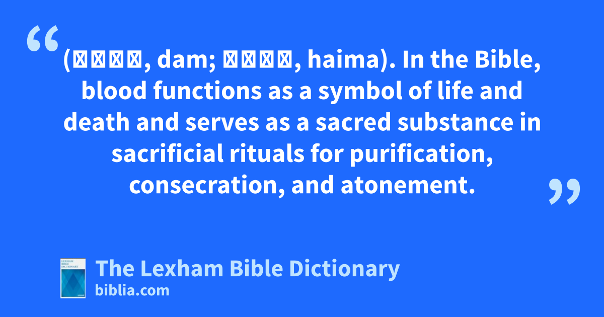 Blood (דָּם, dam; αἷμα, haima). In the Bible, blood functions as a symbol of life and death and serves as a sacred substance in sacrificial rituals for purification, consecration, and atonement.