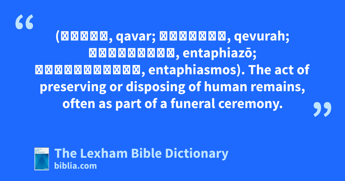 Burial (קָבַר, qavar; קְבֻרָה, qevurah; ἐνταφιάζω, entaphiazō; ἐνταφιασμός, entaphiasmos). The act of preserving or disposing of human remains, often as part of a funeral ceremony.