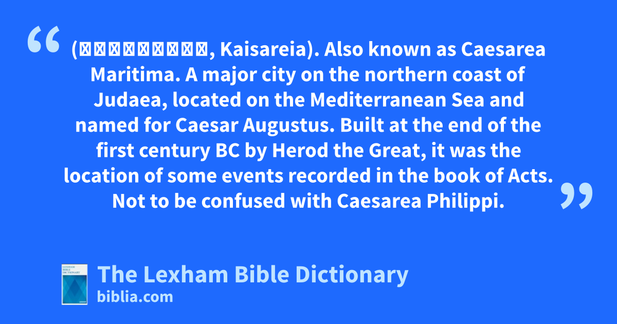 Caesarea (Καισάρεια, Kaisareia). Also known as Caesarea Maritima. A major city on the northern coast of Judaea, located on the Mediterranean Sea and named for Caesar Augustus. Built at the end of the first century bc by Herod the Great, it was the location of some events recorded in the book of Acts. Not to be confused with Caesarea Philippi.