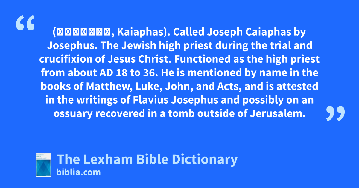 Caiaphas (Καϊάφας, Kaiaphas). Called Joseph Caiaphas by Josephus. The Jewish high priest during the trial and crucifixion of Jesus Christ. Functioned as the high priest from about ad 18 to 36. He is mentioned by name in the books of Matthew, Luke, John, and Acts, and is attested in the writings of Flavius Josephus and possibly on an ossuary recovered in a tomb outside of Jerusalem.