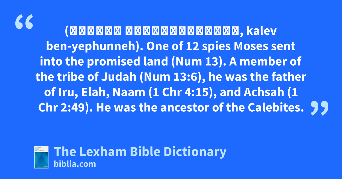 Caleb, Israelite Spy, Son of Jephunneh (כָּלֵב בֶּן־יְפֻנֶּה, kalev ben-yephunneh). One of 12 spies Moses sent into the promised land (Num 13). A member of the tribe of Judah (Num 13:6), he was the father of Iru, Elah, Naam (1 Chr 4:15), and Achsah (1 Chr 2:49). He was the ancestor of the Calebites.