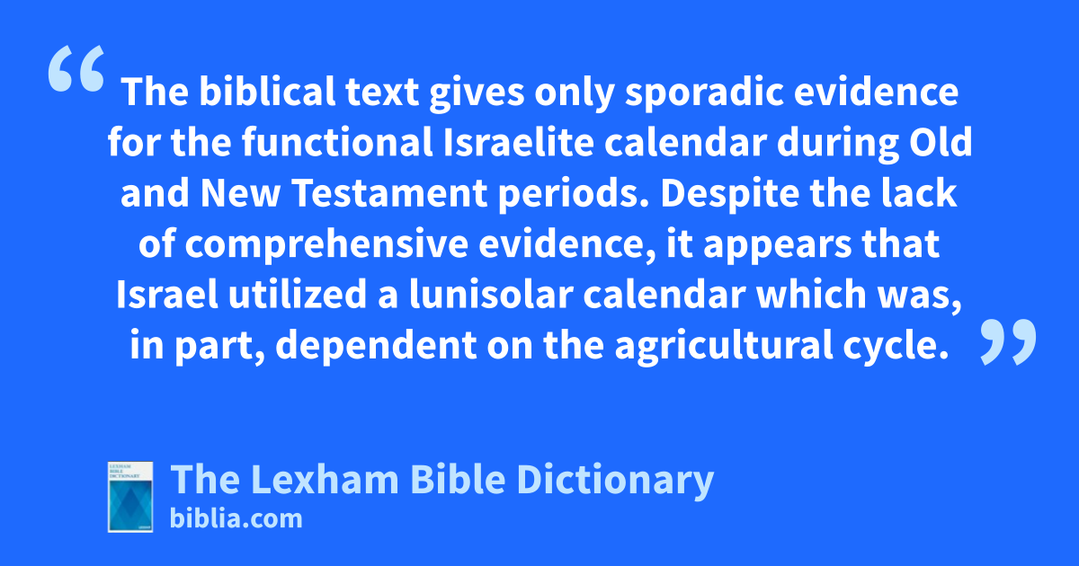 Calendar The biblical text gives only sporadic evidence for the functional Israelite calendar during Old and New Testament periods. Despite the lack of comprehensive evidence, it appears that Israel utilized a lunisolar calendar which was, in part, dependent on the agricultural cycle.