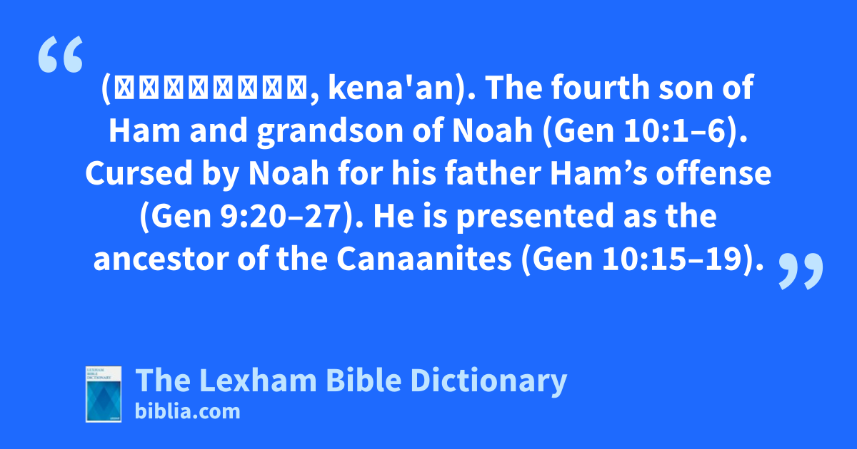Canaan, Son of Ham (כְּנַעַן, kena'an). The fourth son of Ham and grandson of Noah (Gen 10:1–6). Cursed by Noah for his father Ham’s offense (Gen 9:20–27). He is presented as the ancestor of the Canaanites (Gen 10:15–19).