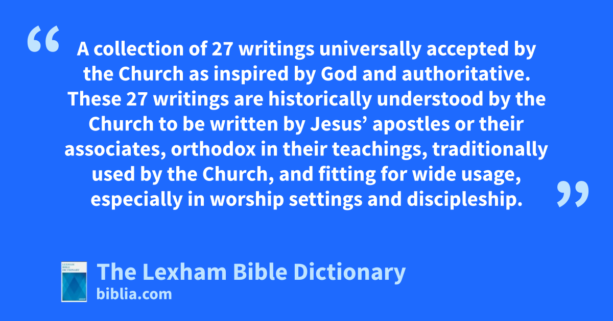 Canon, New Testament A collection of 27 writings universally accepted by the Church as inspired by God and authoritative. These 27 writings are historically understood by the Church to be written by Jesus’ apostles or their associates, orthodox in their teachings, traditionally used by the Church, and fitting for wide usage, especially in worship settings and discipleship.
