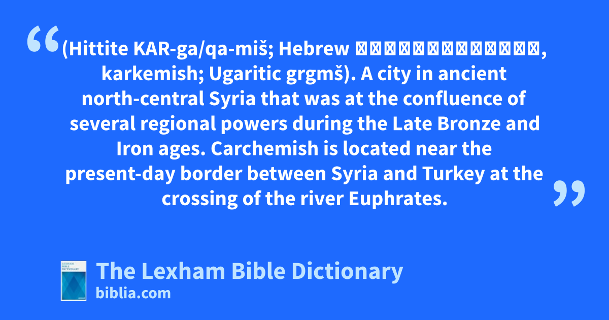Carchemish (Hittite KAR-ga/qa-miš; Hebrew כַּרְכְּמִישׁ, karkemish; Ugaritic grgmš). A city in ancient north-central Syria that was at the confluence of several regional powers during the Late Bronze and Iron ages. Carchemish is located near the present-day border between Syria and Turkey at the crossing of the river Euphrates.