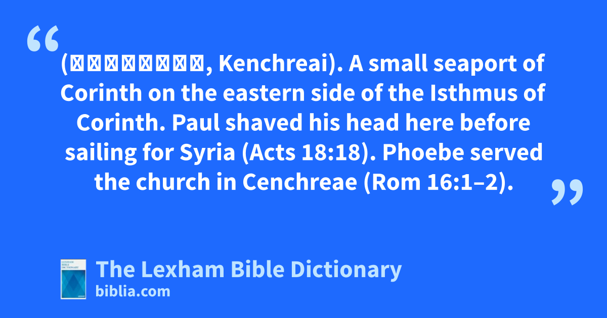 Cenchreae (Κεγχρεαί, Kenchreai). A small seaport of Corinth on the eastern side of the Isthmus of Corinth. Paul shaved his head here before sailing for Syria (Acts 18:18). Phoebe served the church in Cenchreae (Rom 16:1–2).