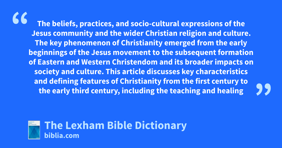 This article discusses key characteristics and defining features of Christianity from the first century to the early third century, including the teaching and healing activity of Jesus Christ, the significance of his death and resurrection, the parting of ways with Judaism, and some distinctively Christian beliefs and practices.