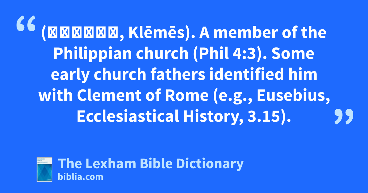 Clement (Κλήμης, Klēmēs). A member of the Philippian church (Phil 4:3). Some early church fathers identified him with Clement of Rome (e.g., Eusebius, Ecclesiastical History, 3.15).