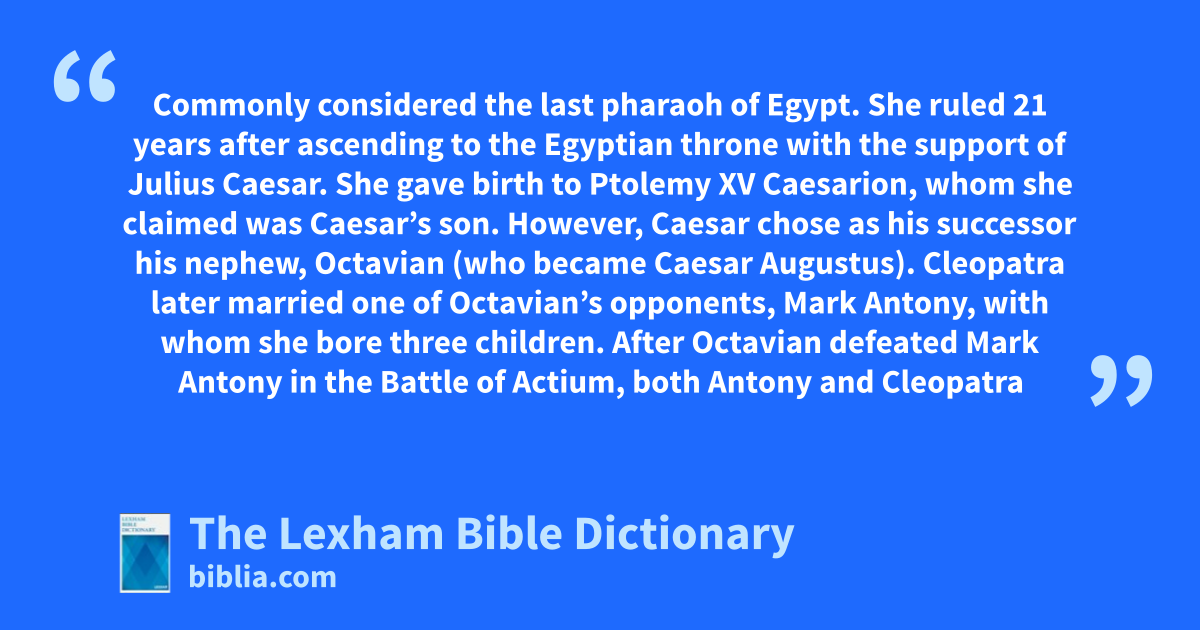 Cleopatra VII Commonly considered the last pharaoh of Egypt. She ruled 21 years after ascending to the Egyptian throne with the support of Julius Caesar. She gave birth to Ptolemy XV Caesarion, whom she claimed was Caesar’s son. However, Caesar chose as his successor his nephew, Octavian (who became Caesar Augustus). Cleopatra later married one of Octavian’s opponents, Mark Antony, with whom she bore three children. After Octavian defeated Mark Antony in the Battle of Actium, both Antony and Cleopatra committed suicide.