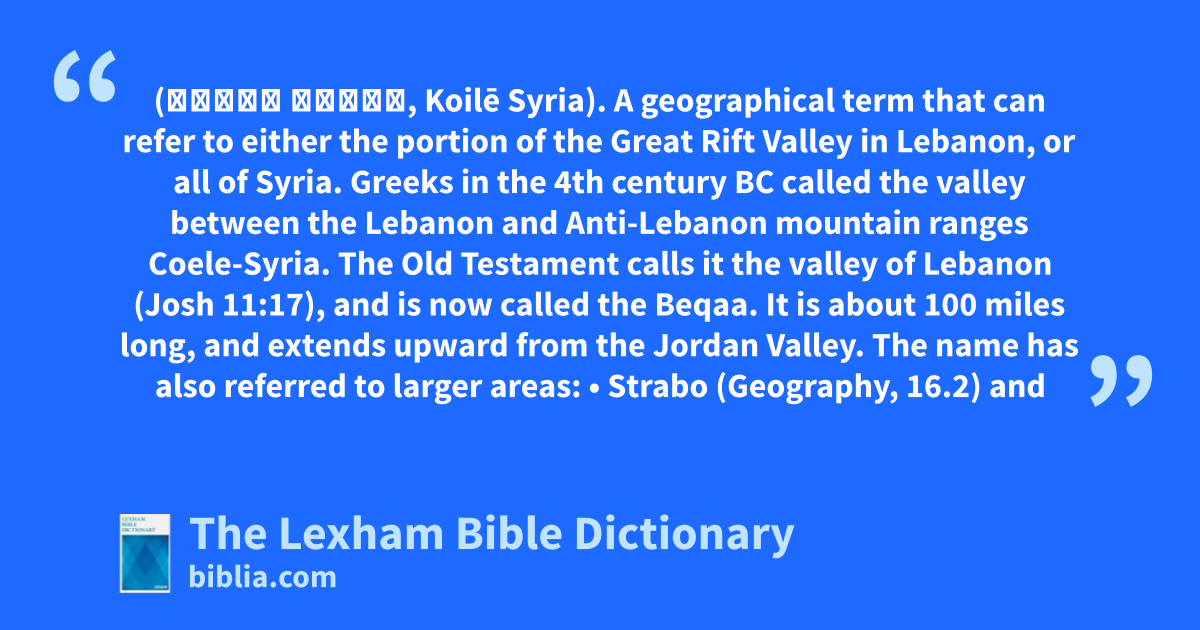 Coele-Syria (Κοιλη Συρια, Koilē Syria). A geographical term that can refer to either the portion of the Great Rift Valley in Lebanon, or all of Syria.