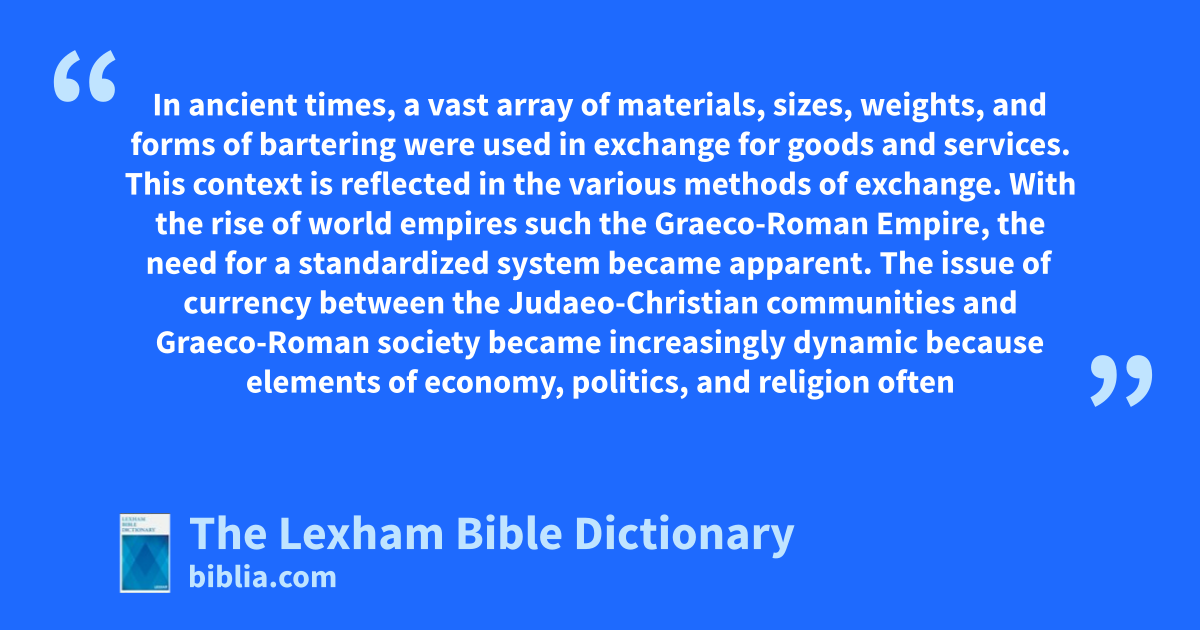 Coinage in Biblical Times In ancient times, a vast array of materials, sizes, weights, and forms of bartering were used in exchange for goods and services. This context is reflected in the various methods of exchange. With the rise of world empires such the Graeco-Roman Empire, the need for a standardized system became apparent.
