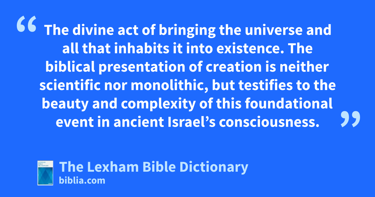 Creation The divine act of bringing the universe and all that inhabits it into existence. The biblical presentation of creation is neither scientific nor monolithic, but testifies to the beauty and complexity of this foundational event in ancient Israel’s consciousness.