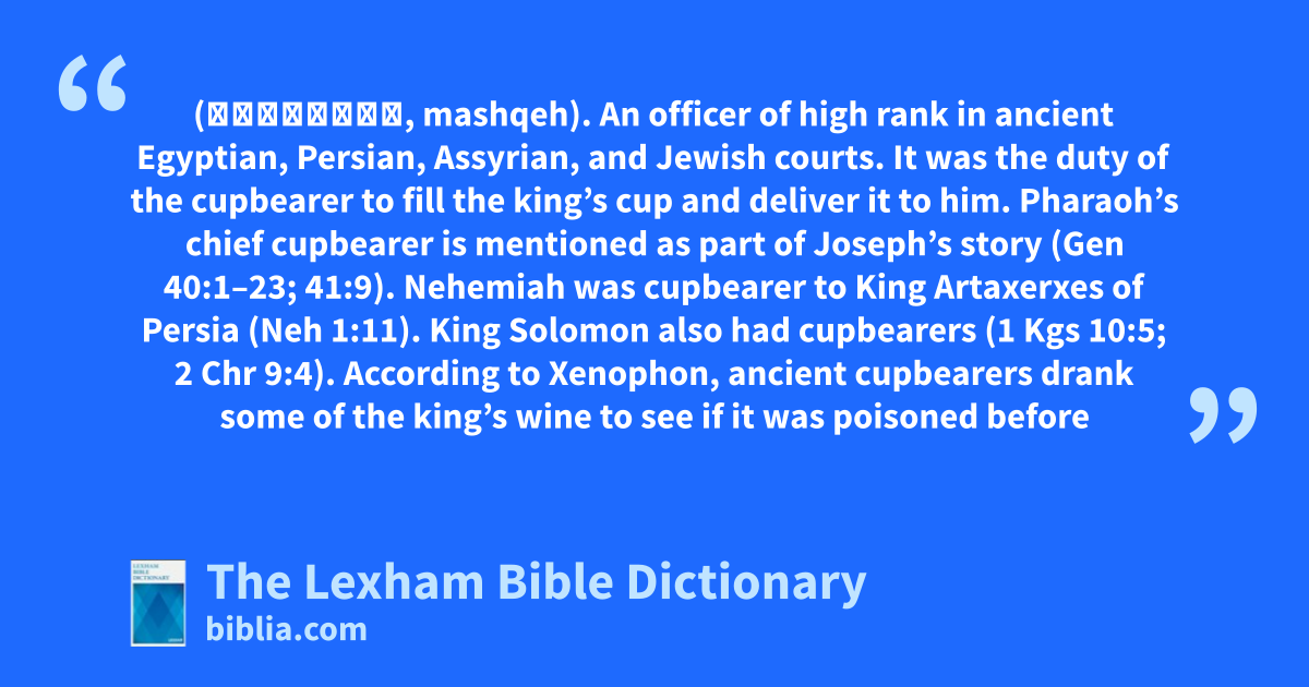 It was the duty of the cupbearer to fill the king’s cup and deliver it to him. Pharaoh’s chief cupbearer is mentioned as part of Joseph’s story (Gen 40:1–23; 41:9). Nehemiah was cupbearer to King Artaxerxes of Persia (Neh 1:11). King Solomon also had cupbearers (1 Kgs 10:5; 2 Chr 9:4).