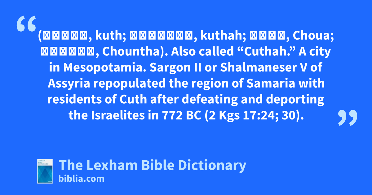 Cuth (כּוּת, kuth; כּוּתָה, kuthah; Χουά, Choua; Χουνθά, Chountha). Also called “Cuthah.” A city in Mesopotamia. Sargon II or Shalmaneser V of Assyria repopulated the region of Samaria with residents of Cuth after defeating and deporting the Israelites in 772 bc (2 Kgs 17:24; 30).