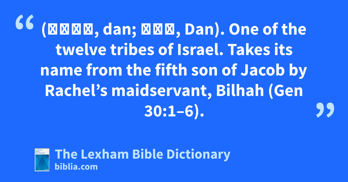 Dan, Tribe Of (דָּן, dan; Δάν, Dan). One of the twelve tribes of Israel. Takes its name from the fifth son of Jacob by Rachel’s maidservant, Bilhah (Gen 30:1–6).