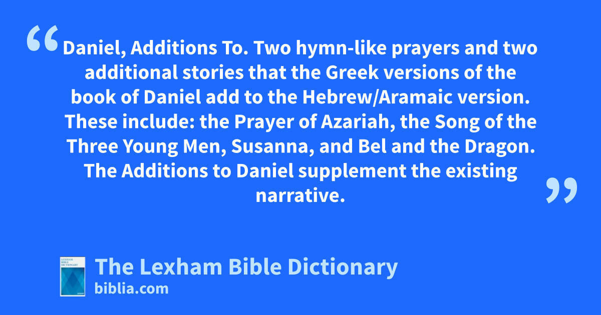 Daniel, Additions To Daniel, Additions To. Two hymn-like prayers and two additional stories that the Greek versions of the book of Daniel add to the Hebrew/Aramaic version. These include: the Prayer of Azariah, the Song of the Three Young Men, Susanna, and Bel and the Dragon. The Additions to Daniel supplement the existing narrative.