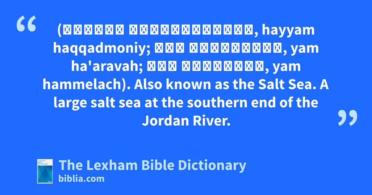 Dead Sea (הַיָּם הַקַּדְמֹנִי, hayyam haqqadmoniy; יָם הָעֲרָבָה, yam ha'aravah; יָם הַמֶּלַח, yam hammelach). Also known as the Salt Sea. A large salt sea at the southern end of the Jordan River.