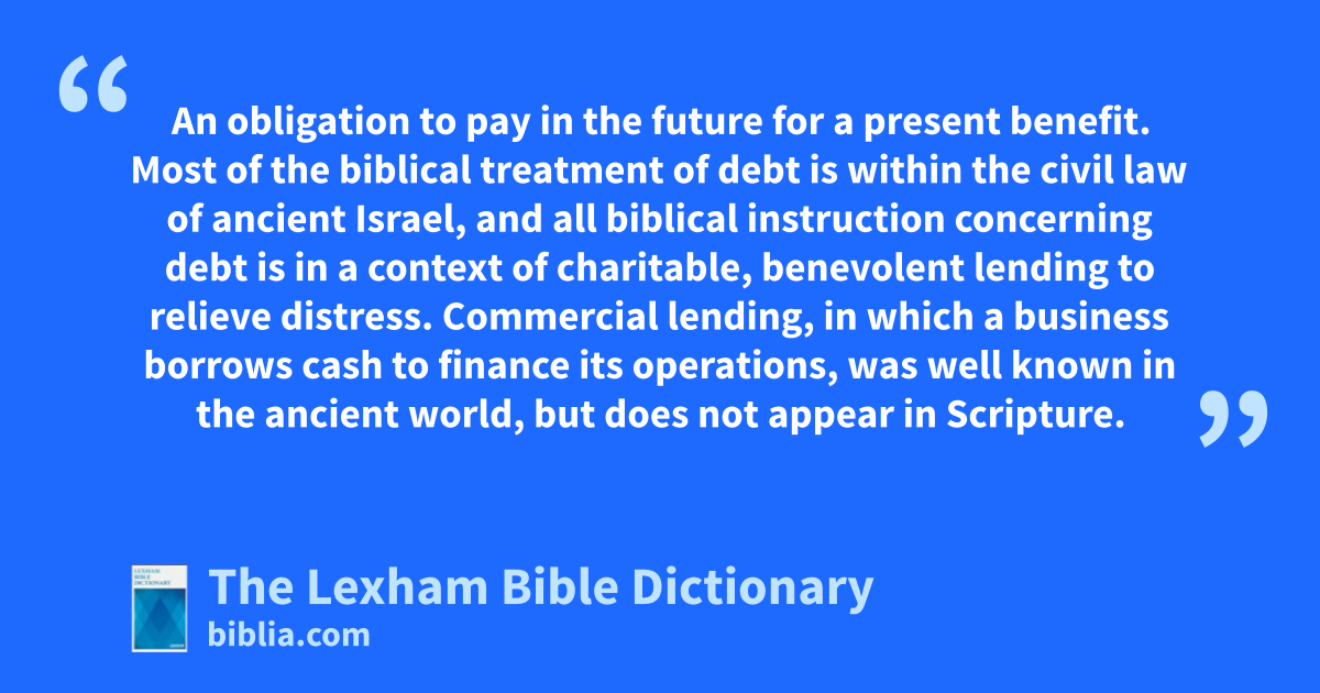 Debt An obligation to pay in the future for a present benefit. Most of the biblical treatment of debt is within the civil law of ancient Israel, and all biblical instruction concerning debt is in a context of charitable, benevolent lending to relieve distress. Commercial lending, in which a business borrows cash to finance its operations, was well known in the ancient world, but does not appear in Scripture.